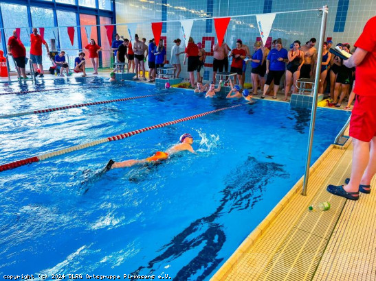 Schlabbeflicker-Cup 05.10.2024 Für Samstag, den 05.10.2024 hat die OG Pirmasens ihre befreundeten Ortsgruppen aus der Umgebung zum Schlabbeflicker-Cup ins PLUB eingeladen – zum ersten Mal nach 5 Jahren Pause fand der Wettkampf wieder in seiner ursprünglichen Form als Mannschaftswettkampf statt. Insgesamt 11 Ortsgruppen mit 25 Mannschaften sind der Einladung nach Pirmasens gefolgt. Wir selbst waren mit 5 Mannschaften dabei. Der Wettkampf war für alle ein voller Erfolg. Mit viel Spaß und Freude gingen die Mannschaften ihren Wettkampf an. Für unsere AK 9/10 weiblich (Lisa Litz, Emma Getmann, Mia Getmann und Elisa Sandhövel) war es der dritte gemeinsame Wettkampf. Die Mädels schwimmen auch ohne Konkurrenz überragende Zeiten. So bleibt dieser Pokal in Pirmasens. Die ... Mehr erfahren