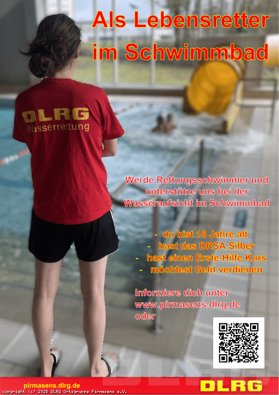 Als Lebensretter im Schwimmbad Werde Rettungsschwimmer und unterstütze uns bei der Wasseraufsicht im Schwimmbad! Du bist 18 Jahre alt Du hast das DRSA Silber Du hast einen Erste-Hilfe Kurs Du möchtest Geld verdienen Informiere dich unter hier. ... Mehr erfahren