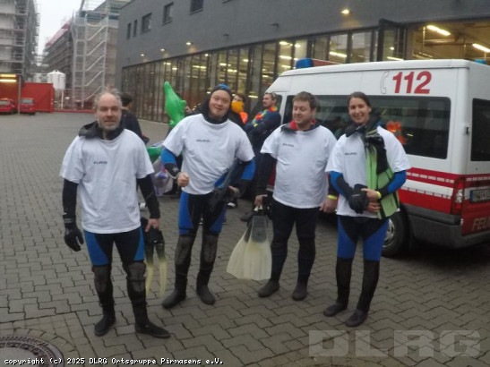 Am letzten Tag des Jahres sind vier Schwimmer und eine Schwimmerin unserer Ortsgruppe, wie schon in den Jahren zuvor, der Einladung der Feuerwehr Mainz zum Silvesterabschwimmen im Rhein gefolgt. Früh am Silvestertag ging es mit dem MTW der Ortsgruppe nach Mainz, in die Feuerwache zwei. Nachdem wir uns alle in unsere Neoprenanzüge geschossen haben, ging es mit dem Shuttle ans Rheinufer. Nach Grußworten aus Politik und Feuerwehr war es gegen 10.00 Uhr endlich so weit! Zusammen mit rund 200 anderen Schwimmern aus der Blaulichtfamilie (Feuerwehr, DLRG, THW, Polizei) ging es in die kalten Fluten – frostige 10°C Wassertemperatur hatte der Rhein im Angebot. Mit viel Spaß legten wir die kurze Strecke von 500 Metern zurück. Am Ende der Strecke warteten eine warme Dusche und ein heißer ... Mehr erfahren